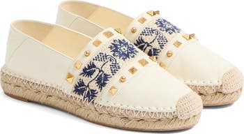 Folkloric embroidery framed with signature pyramid studs lends boho-chic appeal to this leather espadrille expertly crafted in Italy.