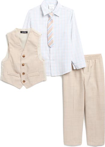 Your kiddo will be looking dapper as can be in this special-occasion set featuring a plaid button-up shirt and a coordinating vest, tie and pants.