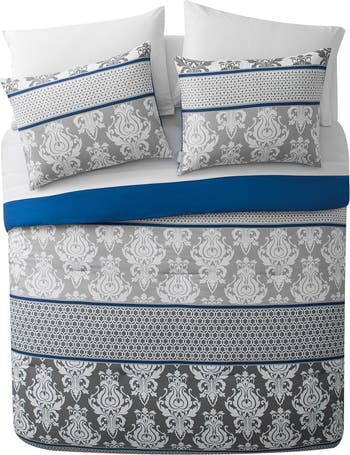 Make your bedroom d cor pop with pattern with the VCNY Home Beckham Blue Damask Bed-in-a-Bag Comforter Set, which features a beautiful blend of damasks and small scale prints in grey, white, and blue. Made of supremely soft microfiber, this 6 or 8-piece bed set includes a comforter, shams (one sham in Twin set), bedskirt, pillowcases (one pillowcase in Twin set), flat sheet and a fitted sheet for an effortlessly elegant bed transformation in minutes.