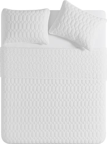 Refresh your bedroom decor with this three-piece quilt set made of wrinkle-resistant polyester and detailed with decorative stitching.