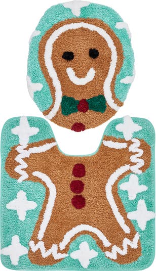 Add a festive touch to your bathroom decor with this softly tufted bath mat and toilet cover set made with nonslip backing with a charming gingerbread man design.