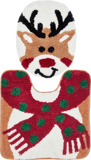 Add a festive touch to your bathroom decor with this softly tufted bath mat and toilet cover set made with nonslip backing with a charming reindeer design.