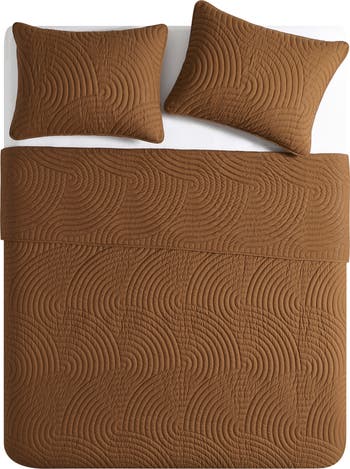 Refresh your bedroom decor with this three-piece quilt set made of wrinkle-resistant polyester and detailed with decorative stitching.