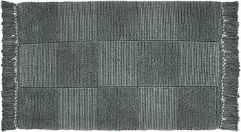 Update your bathroom with this contemporary bath rug that features a checkered stonewashed design woven from piled cotton with fringe tassel edges.