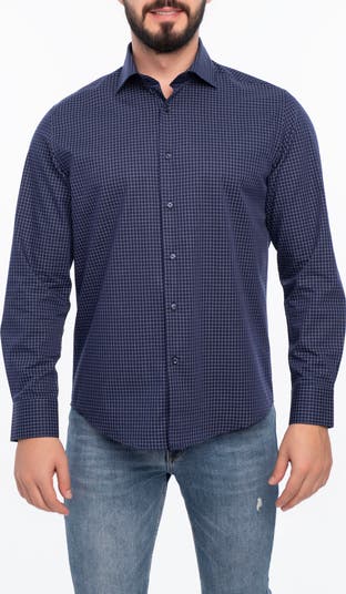 Crisp cotton keeps you comfortable all day in a slim-fit shirt styled with a cool grid print and button-down collar.