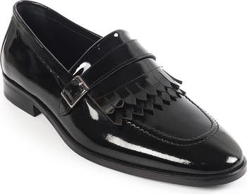 A slim monk strap bridges the vamp of this apron-toe loafer topped with layered kiltie fringe and rendered in glossy patent leather.