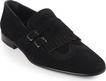 A double-buckle monk strap bridges the vamp of this wingtip loafer topped with vintage-inspired kiltie fringe and rendered in buttery suede.