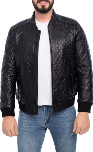 Show off timelessly cool style in this quilted lambskin leather bomber jacket constructed with stretchy ribbed trim and secure zip pockets.
