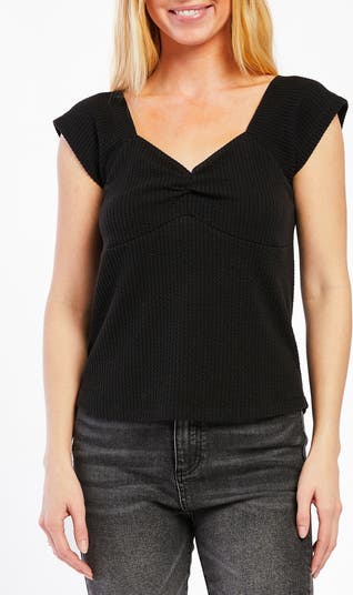 Soft twisted texture enhances the sweet look of this knit top framed by a sweetheart neckline and short sleeves.