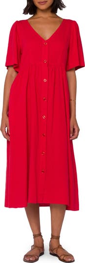 A linen-forward blend ensures you'll have a comfortable fit and feel in a midi dress fronted by a row of buttons that allow you to customize your coverage.