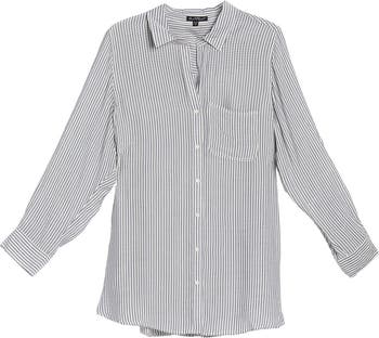 A slender stripe print adorns a lightweight button front tunic shirt for effortless style. Fit: this style fits true to size.
