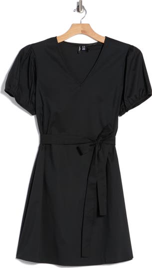 This cotton‑blend V‑neck dress is finished with short puff sleeves and a waist tie that defines the silhouette.