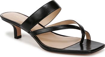 An angular square toe and kitten heel balance a strappy slide sandal fitted with a stylish toe ring for modern appeal.