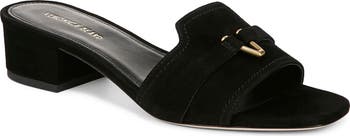A brushed hardware ornament adds visual intrigue to the vamp of a supple suede sandal set on a cushioned footbed and low block heel for lasting wear.