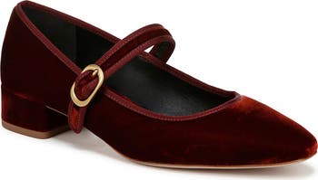 An adjustable mary jane strap gives a retro sweetness to a pump balanced between a slender square toe and low block heel.