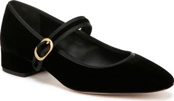 An adjustable mary jane strap gives a retro sweetness to a pump balanced between a slender square toe and low block heel.