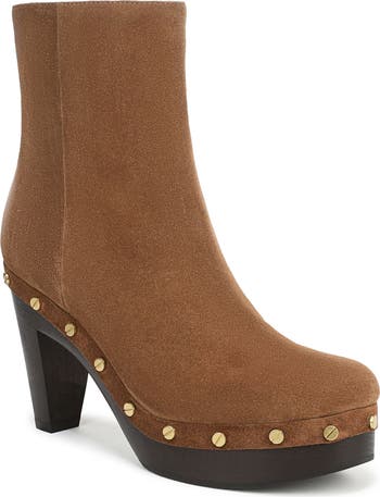 Polished midsole studs and a woodgrain platform add a retro aesthetic to a supple suede bootie lifted by a tapered block heel and fastened with a full-length side zipper.