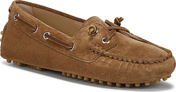 A pebbled rubber sole lends excellent traction to an elevated boat shoe crafted from richly grained leather with a polished moc toe.