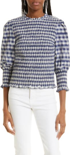 Sweet smocking shapes this lively checked top framed by puff sleeves and fanciful frills.