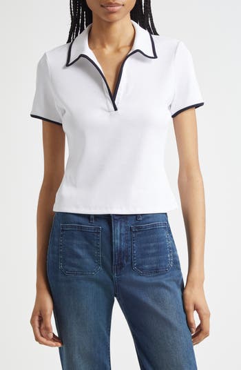 A jaunty collar and contrast piping polish a warm-weather top softly ribbed in stretch-kissed cotton.
