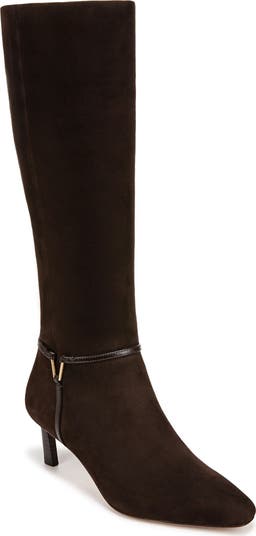 Dainty goldtone hardware gleams at the ankle of a knee-high boot shaped from smooth suede.