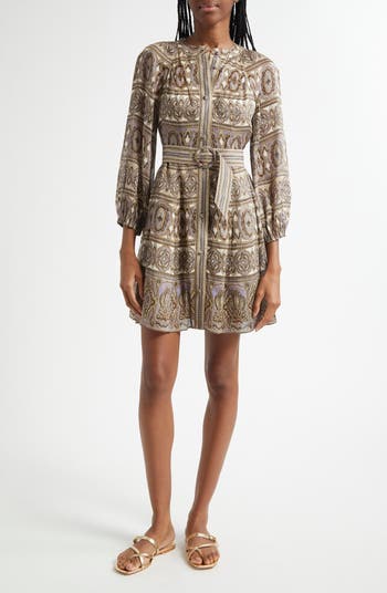 An intricate paisley print brings timeless appeal to a belted dress set with billowed sleeves and crafted in a luxe blend of linen and silk.