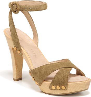 A wooden heel, stud trim and soft suede further elevate this platform sandal that concludes with a slim, ankle-highlighting buckle strap.