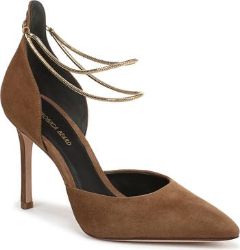 Jewelry-inspired ankle straps heighten the modern glamour of this d'Orsay pump set on a lofty stiletto heel.