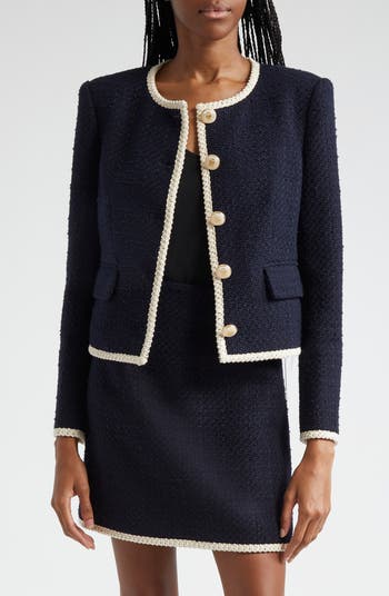 Contrast trim traces the polished silhouette of a tweedy jacket fastened with pearly crested buttons.