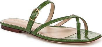Textured metallic-leather straps bring a flashy gleam to this square-toe sandal that's a modern choice for casual and looks-of-fancy ensembles alike.