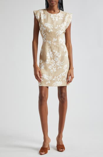 Pretty blooms and extended shoulders define a summery dress cut from a cool linen blend.