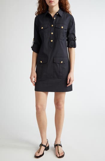 Glossy goldtone buttons and utilitarian-inspired patch pockets punctuate this stretch-kissed cotton dress that lets you switch up the look with convertible sleeves.
