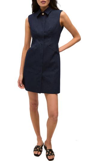 Level up denim day in a dark-rinsed shirtdress served in a summery, sleeveless silhouette and cut to a leg-baring length.
