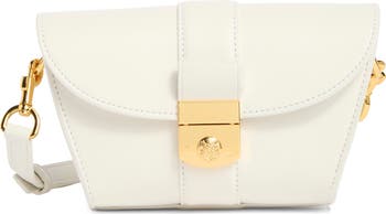 A sculptural silhouette and crest-embellished lock lend a vintage feel to this structured bag furnished with a removable crossbody strap.