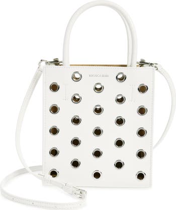 Shiny grommets create a cool, peekaboo effect on this compact leather shopper perfect for carrying your daily essentials by hand or over the shoulder.