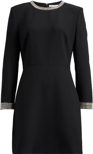 Rows of sparkling rhinestones adorn the neckline and cuffs of this leggy mini that will make a dazzling addition to your LBD collection.