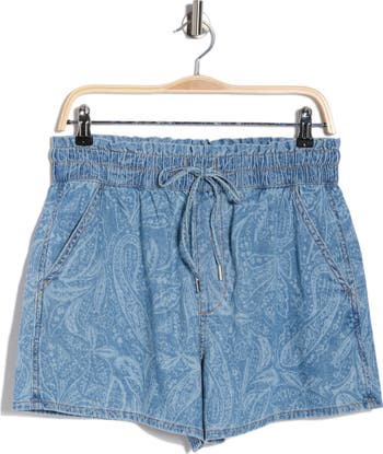 A paisley print enhances the sunny-day charm of these lightweight cotton-denim shorts framed by an elastic-drawstring waist and handy pockets.