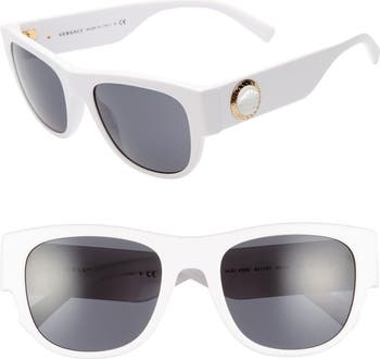 A signature Medusa-head medallion accents the temples of bold sunglasses featuring a squared-off silhouette and smoky grey lenses.