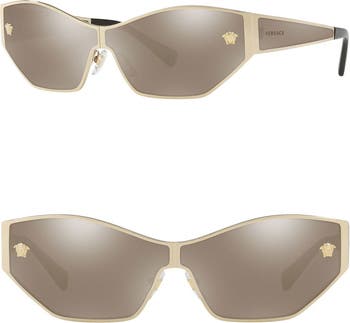 - Style: mirror shield - Size: 67-03-140mm (eye-bridge-temple) - Frame Color: Gold - Lens Color: Mirror gold - Frame Material: Metal - Lens Material: Plastic - Protection: 100% UV - Made in Italy Proposition 65 is a California regulation that requires special warnings to be presented to customers if a product contains certain quantities of chemicals or toxicants known to the State of California to cause cancer, birth defects, or other reproductive harm.