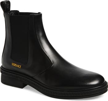 Gilt logo lettering and Greek-key detailing at the midsole brings signature Versace flair to this updated Chelsea boot made in Italy from burnished calfskin leather.