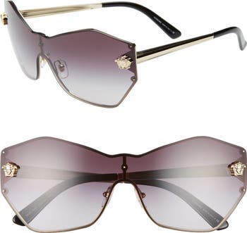 Signature Medusa hardware gleams on the angular shield lens of glamorous sunglasses designed to turn heads.