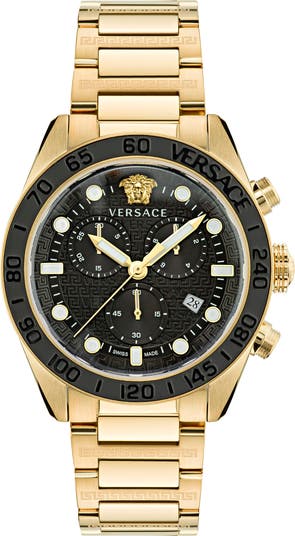 An iconic Medusa head and embossed Greek keys elevate a Swiss-made bracelet watch for elegant, signature style.