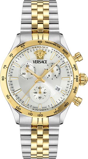 Show off polished style in this two-tone bracelet watch featuring a sunray dial with precise three-hand movement, chronograph subdials and a clear date window.