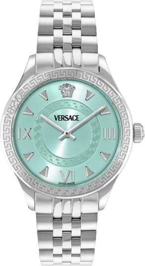 A 3D Medusa head centers the sunray dial of an opulent watch outlined with house-signature Greek-key detailing at the bezel and set on a polished link bracelet.