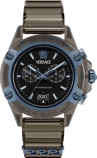 A Swiss-made chronograph watch detailed with an iconic Medusa head and two sub-eyes is fitted with a bold silicone strap for sporty appeal.