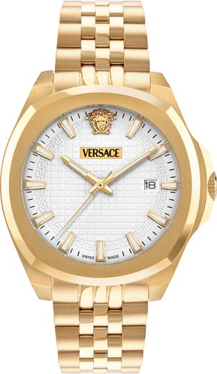 Medusa-head hardware and a guilloche dial bordered with a Greca-key motif put house-signature touches on this Swiss-quartz timepiece fitted with a high-polish stainless steel bracelet.