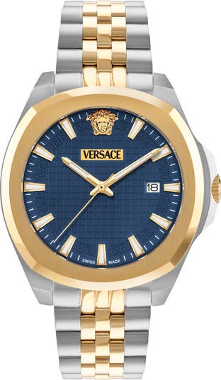 Medusa-head hardware and a guilloche dial bordered with a Greca-key motif put house-signature touches on this Swiss-quartz timepiece fitted with a two-tone stainless steel bracelet.