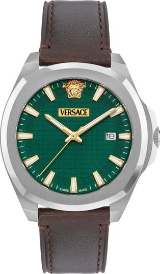 A signature Greek-key motif textures the dial of this watch powered by precise Swiss-quartz movement and set upon a leather strap. A Medusa-head crown adds an understated heritage finish to your timepiece.