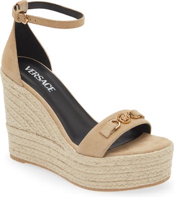 Versace throws it back to the '90s with this ankle-strap sandal branded with Medusa '95 hardware and grounded by a jute-wrapped wedge and platform.