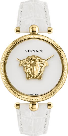 Medusa's head punctuates the minimalist dial aesthetic on this opulant watch secured by a croc-embossed leather strap.